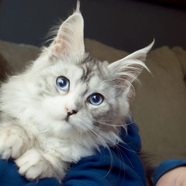 Flora is currently our only blue eyed Maine Coon and after her last vet check she’ll be ready for some wonderful humans! From what I can tell she is a high black silver with white and her momma and daddy are Miso + Aslan so she’s going to be one stunning girl! 🌸 she does have a minor umbilical hernia (PURELY COSMETIC) and her price reflects that.